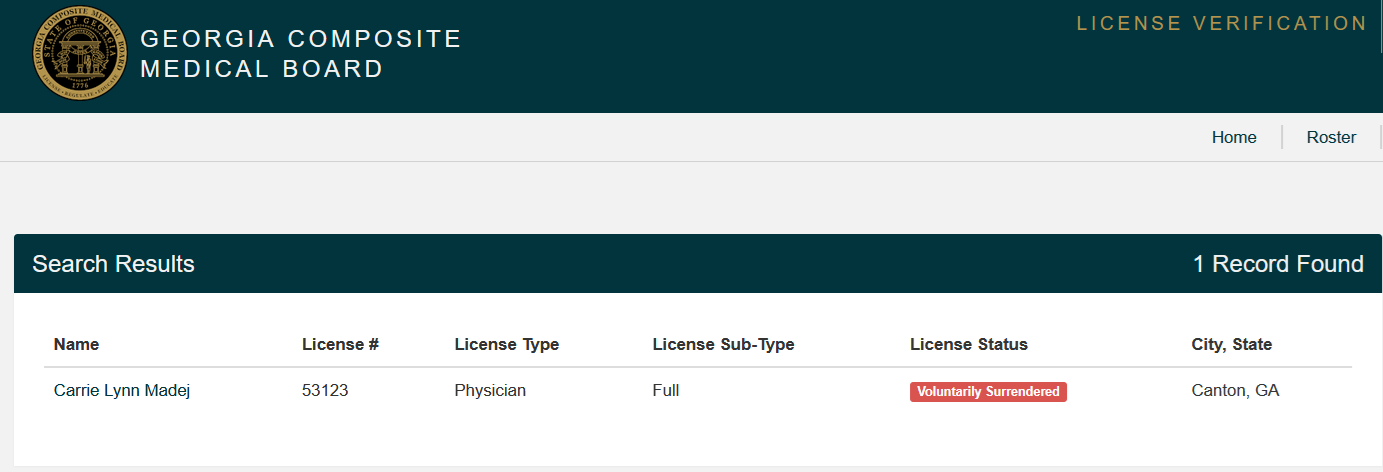 Madej had a medical license as D.O. in the state of Georgia (license #53123), but that’s gone now. “Voluntarily surrendered” when she faced a medical board investigation.